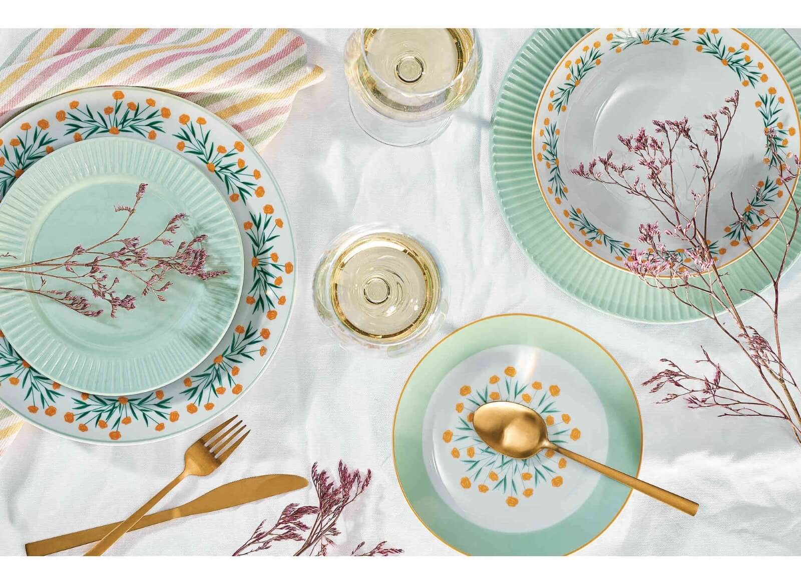 Para quem procura um serviço de mesa em tons neutros, a coleção Inbloom da KASA é perfeita. Este conjunto está disponível na versão branco floral e com padrão Vichy que podem ser combinados com peças lisas (sem padrão) em tons verde, amarelo e rosa pastel.