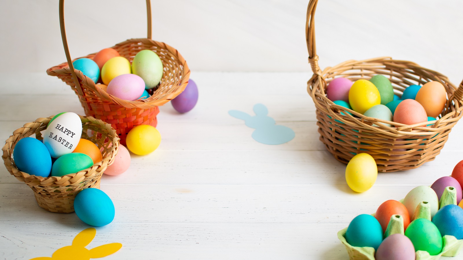 Os cestos também são uma parte importante da caça aos ovos. Prepare um para cada criança, de forma que possam colher os ovos que encontrarem. Os cestos de verga simples são uma boa opção e podem ser decorados com fitas, ou optar por um recipiente de comida e colar uns coelhos de cartolina para animar.