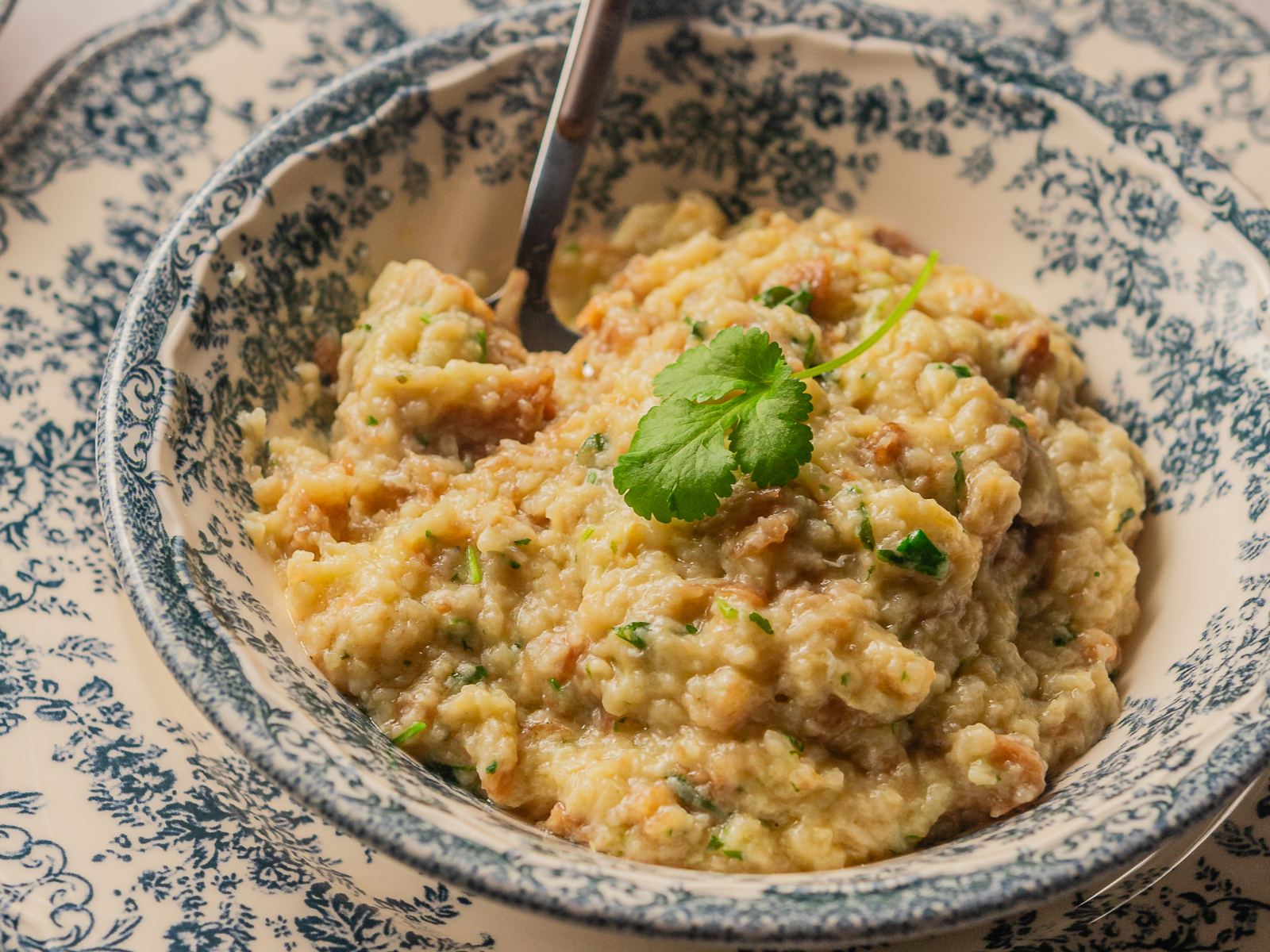 Verta a água aquecida no tacho para criar a açorda (a quantidade de água necessária pode variar de acordo com o tipo de pão utilizado). A açorda deverá ficar com uma textura cremosa e nessa altura desligue o lume.