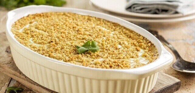 Verta o bechamel sobre o bacalhau, polvilhe com o pão ralado aromatizado e leve ao forno pré-aquecido a 180ºC, durante 10 minutos.