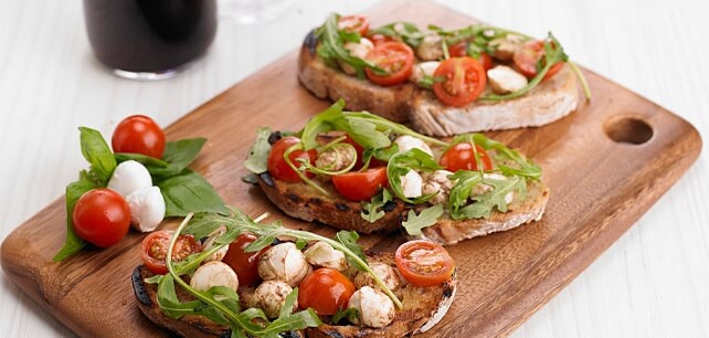 Regue o pão com o azeite restante. Coloque o preparado de queijo e tomate no topo de cada fatia e sirva com mais rúcula e manjericão.