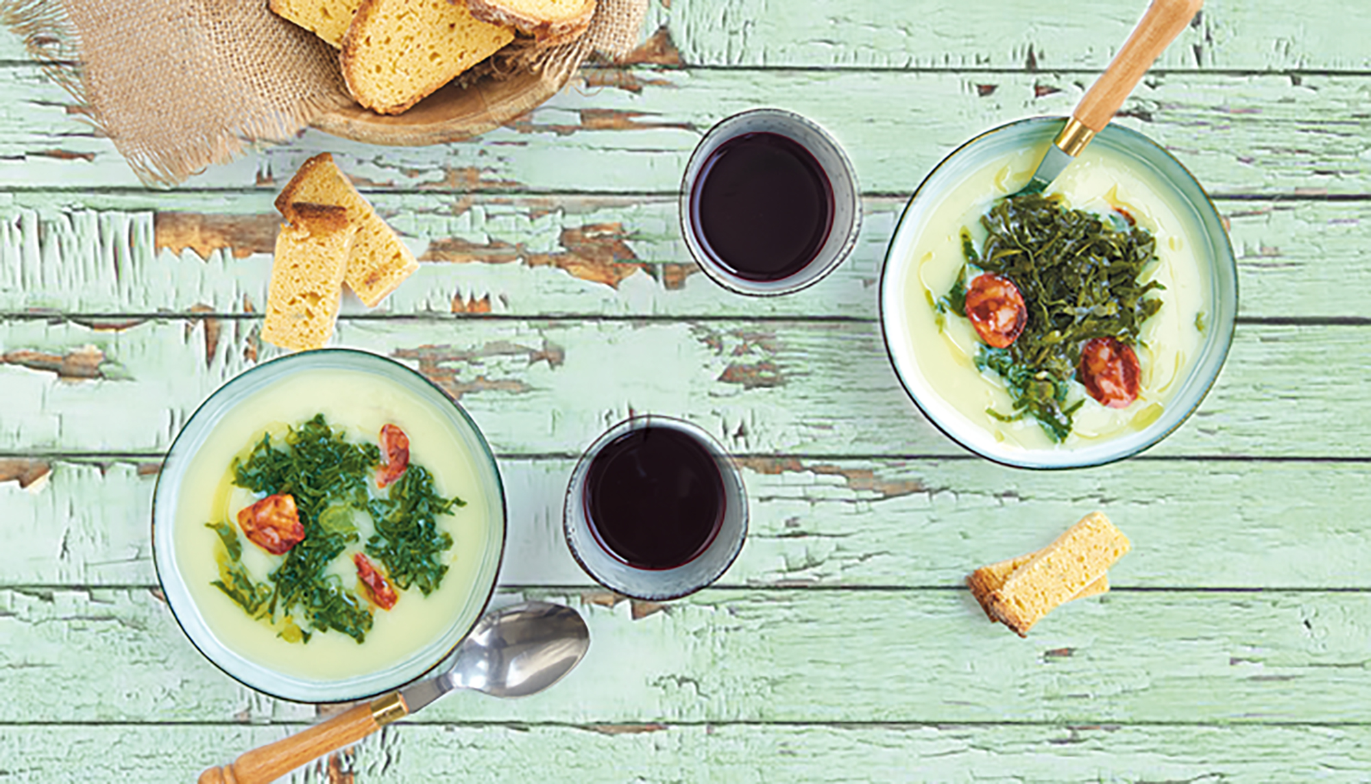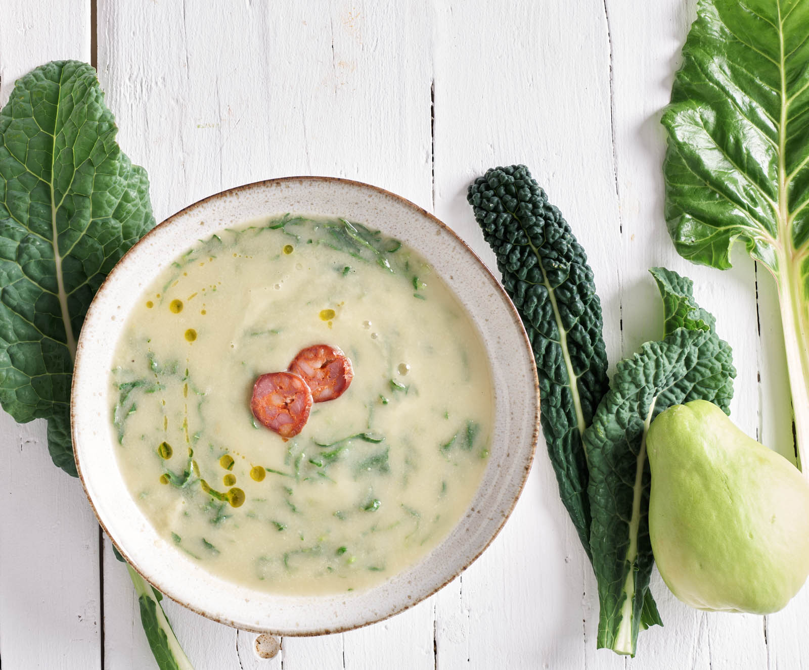 Sirva o caldo verde em taças e coloque por cima as fatias de chouriço. Regue com um fio de azeite.