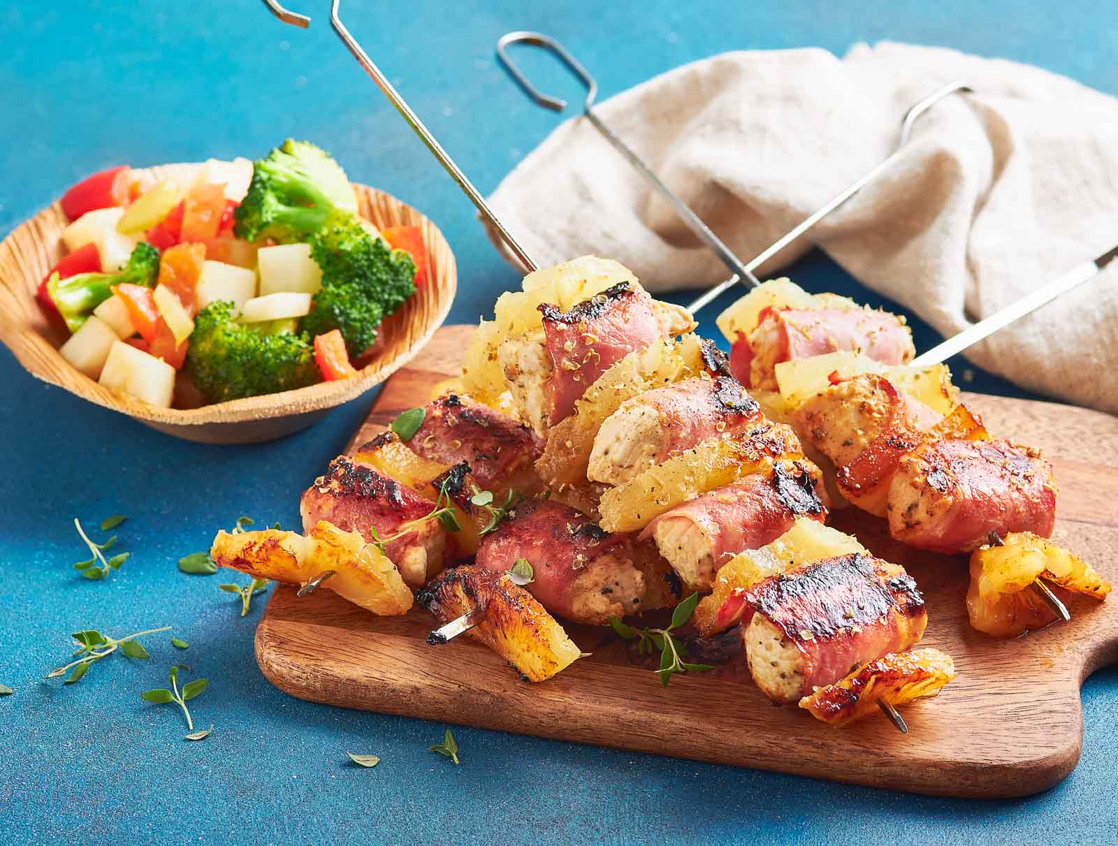 Faça as espetadas, enfie os cubos de peru em espetos de madeira alternando com as meias chalotas, os meios tomates cereja e o ananás aos cubos.