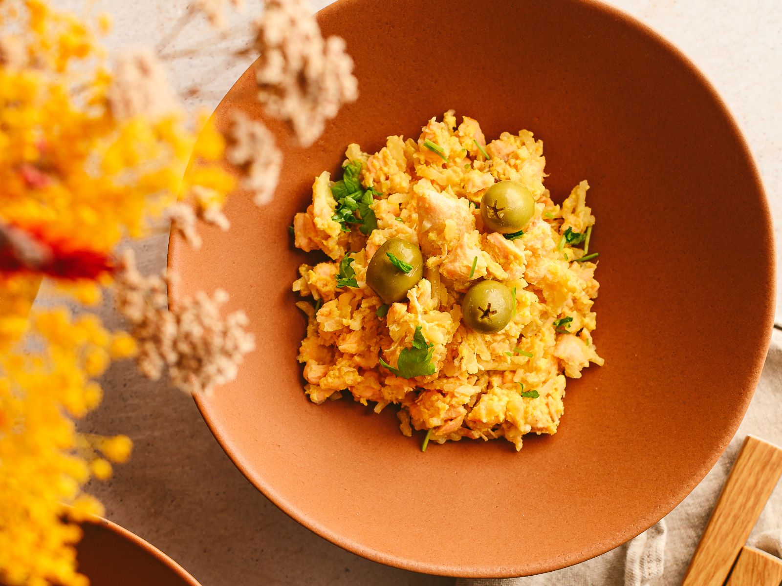 Sirva o arroz previamente cozinhado em pratos e coloque com a feijoada de salmão por cima. Guarneça a feijoada de salmão com salsa fresca picada.