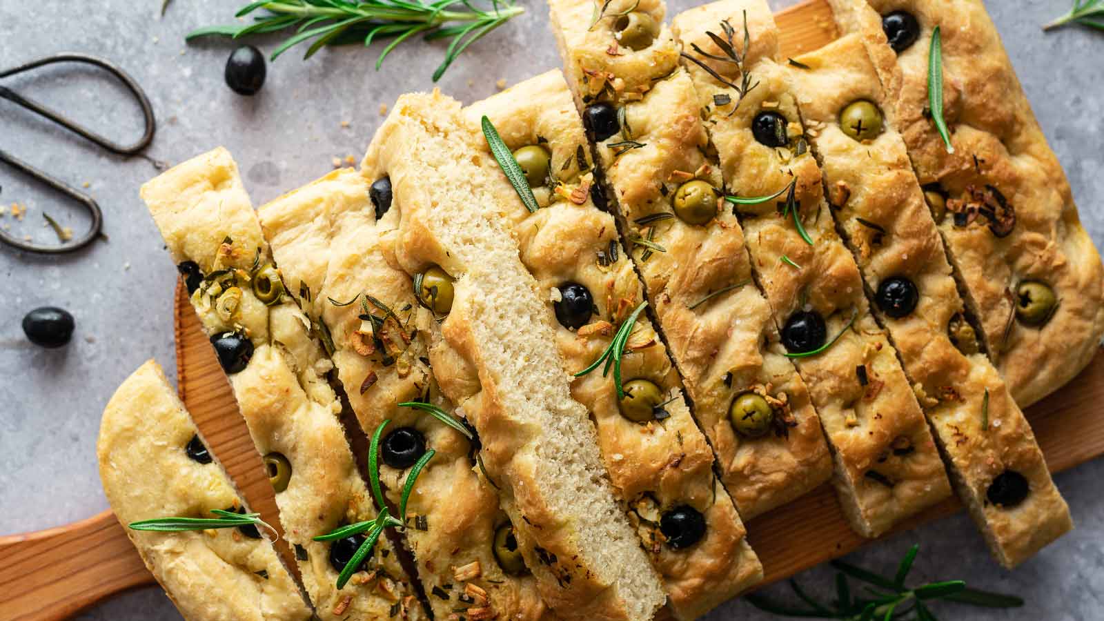 Faça pequenos orificios com os dedos sobre a massa, espalhe as azeitonas e regue com o molho vinagrete. Se necessário unte com um pincelo.