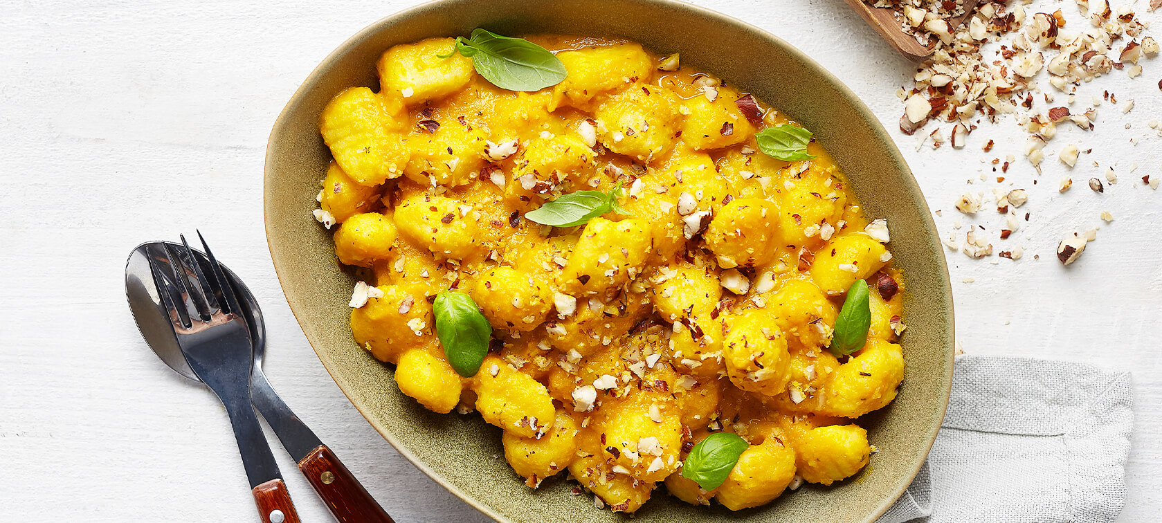 Este gnocchi com molho de abóbora e avelãs é um prato vegetariano cheio de cor e sabor. Com raízes italianas, transporta quem o prova para outras paragens. Experimente.