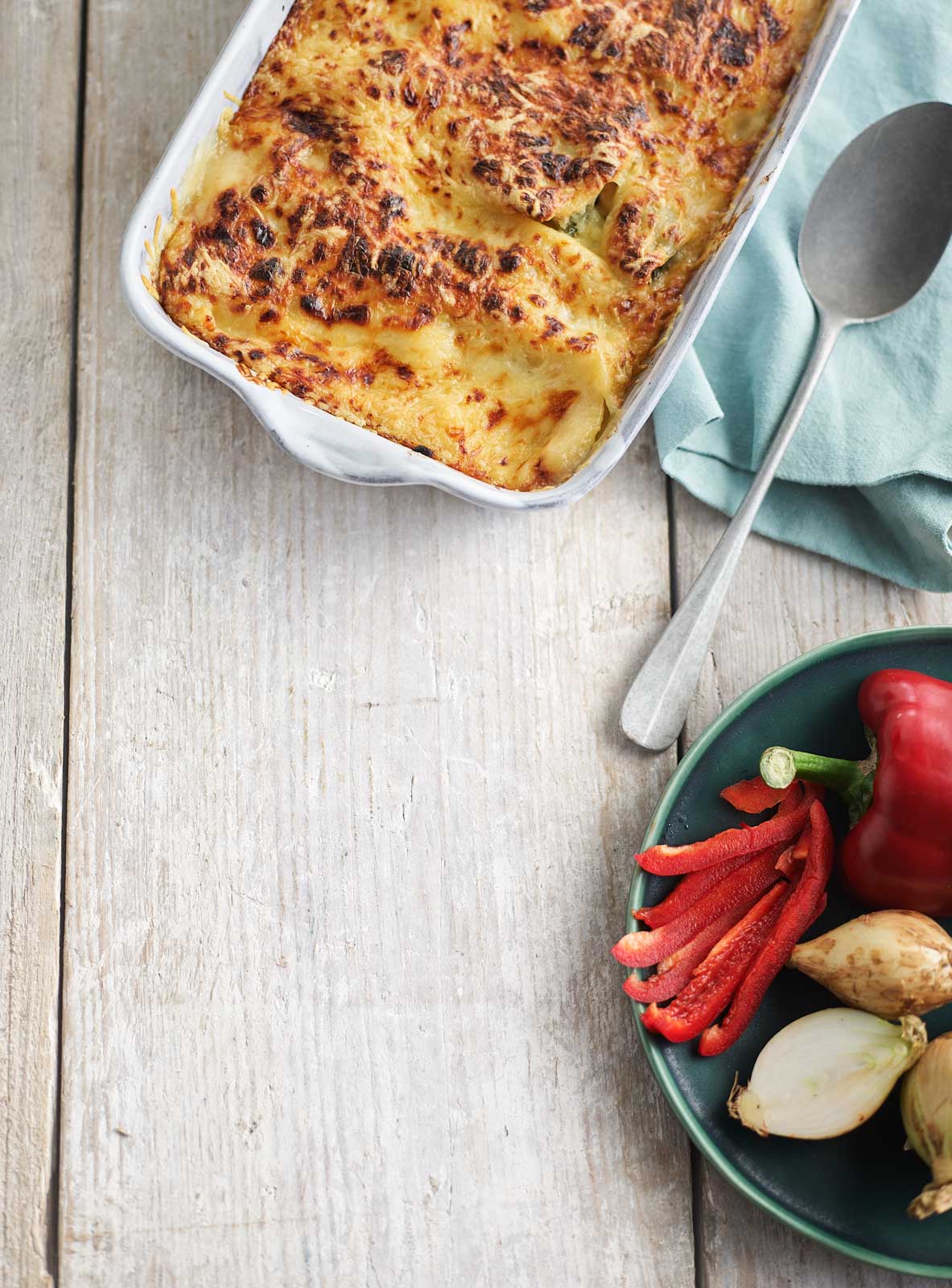 • Adicione uma camada de vegetais cozinhados e regue com um pouco de molho bechamel.