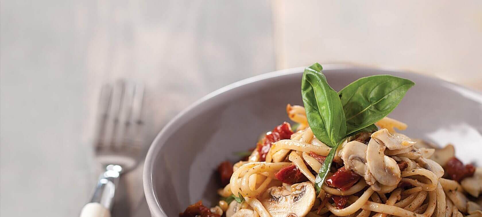 Numa frigideira aquecida colocar o azeite e os alhos picados, depois laminar os cogumelos e adicioná-los ao refogado, logo seguidos do linguine e dos coentros frescos cortados. Deixe refogar.
