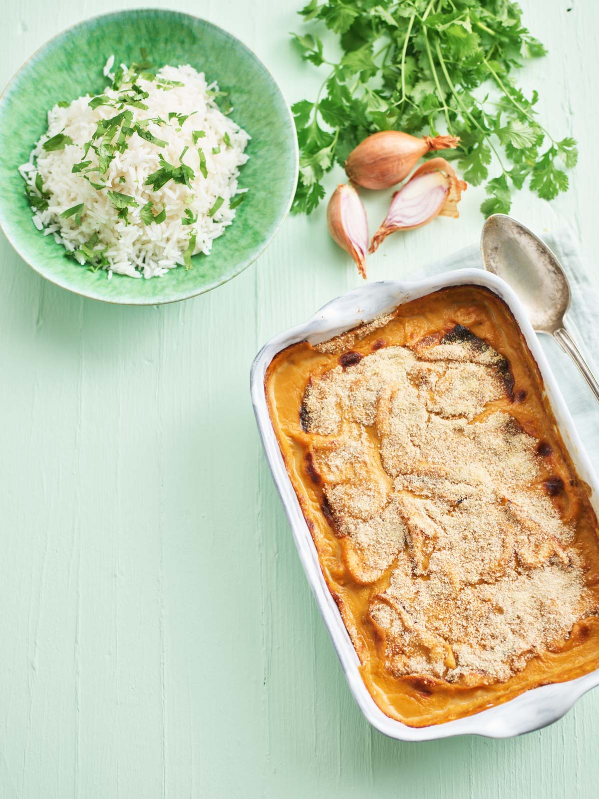 Adicione a manteiga, a bebida vegetal de aveia, o sal, a pimenta e a noz-moscada e envolva tudo muito bem.