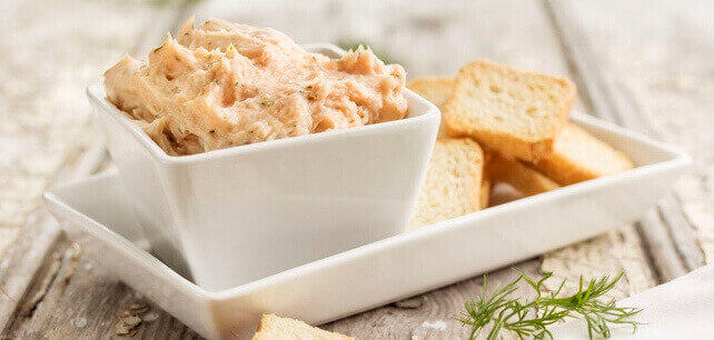 Singular na sua cor e sabor, o patê de salmão fumado casa bem com tostas. Experimente este preparado leve e fresco e delicie-se!