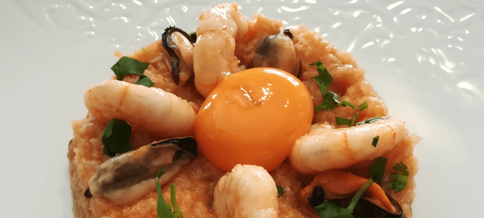Coloque o açafrão num copo com água quente, reserve em infusão enquanto cozinha o marisco. Junte o caldo de peixe e o vinho num tacho até levantar fervura, baixe o lume e adicione as gambas durante 2 minutos. Adicione as lulas e cozinhe durante 1 minuto. Retire o marisco e reserve.