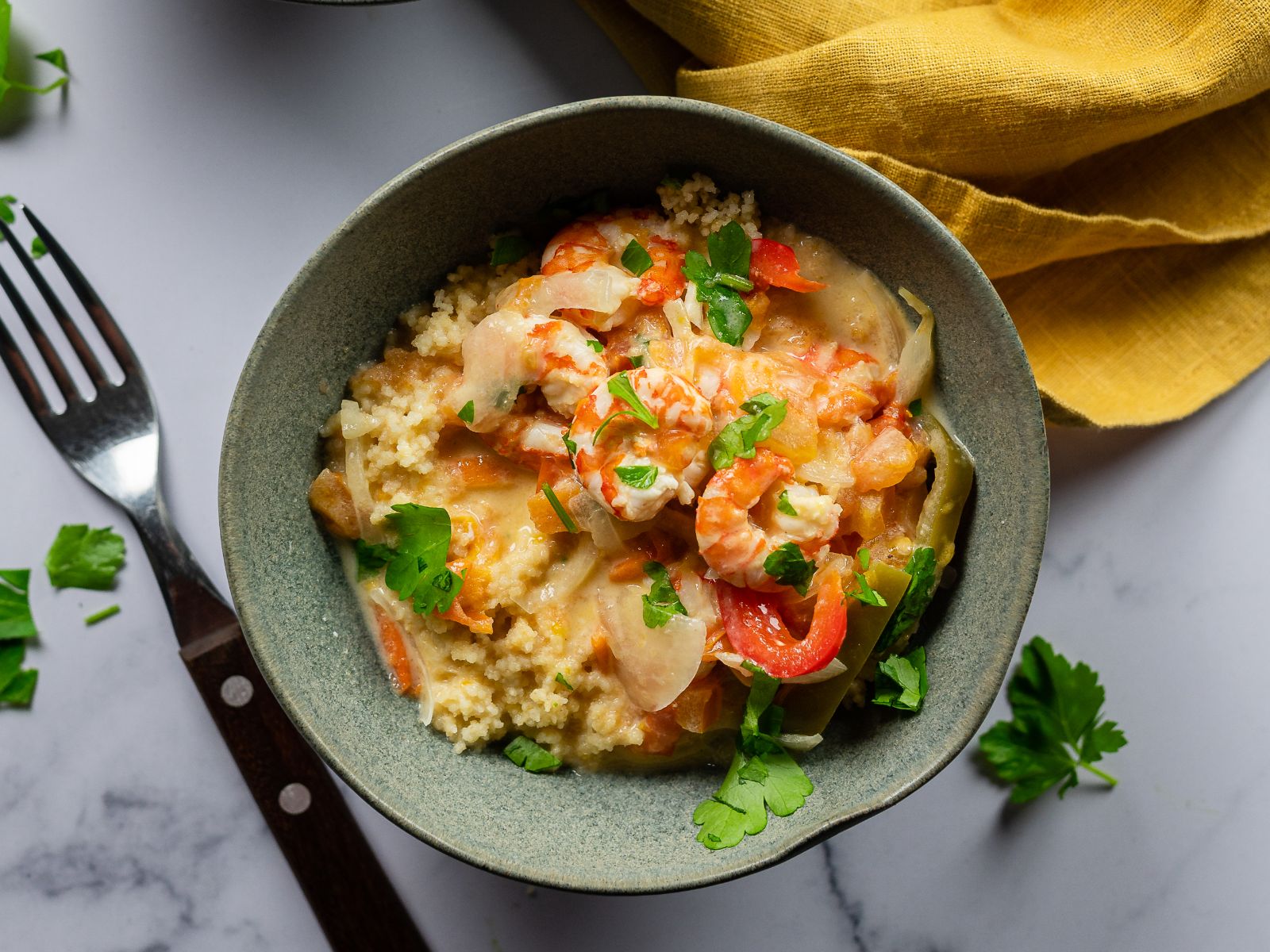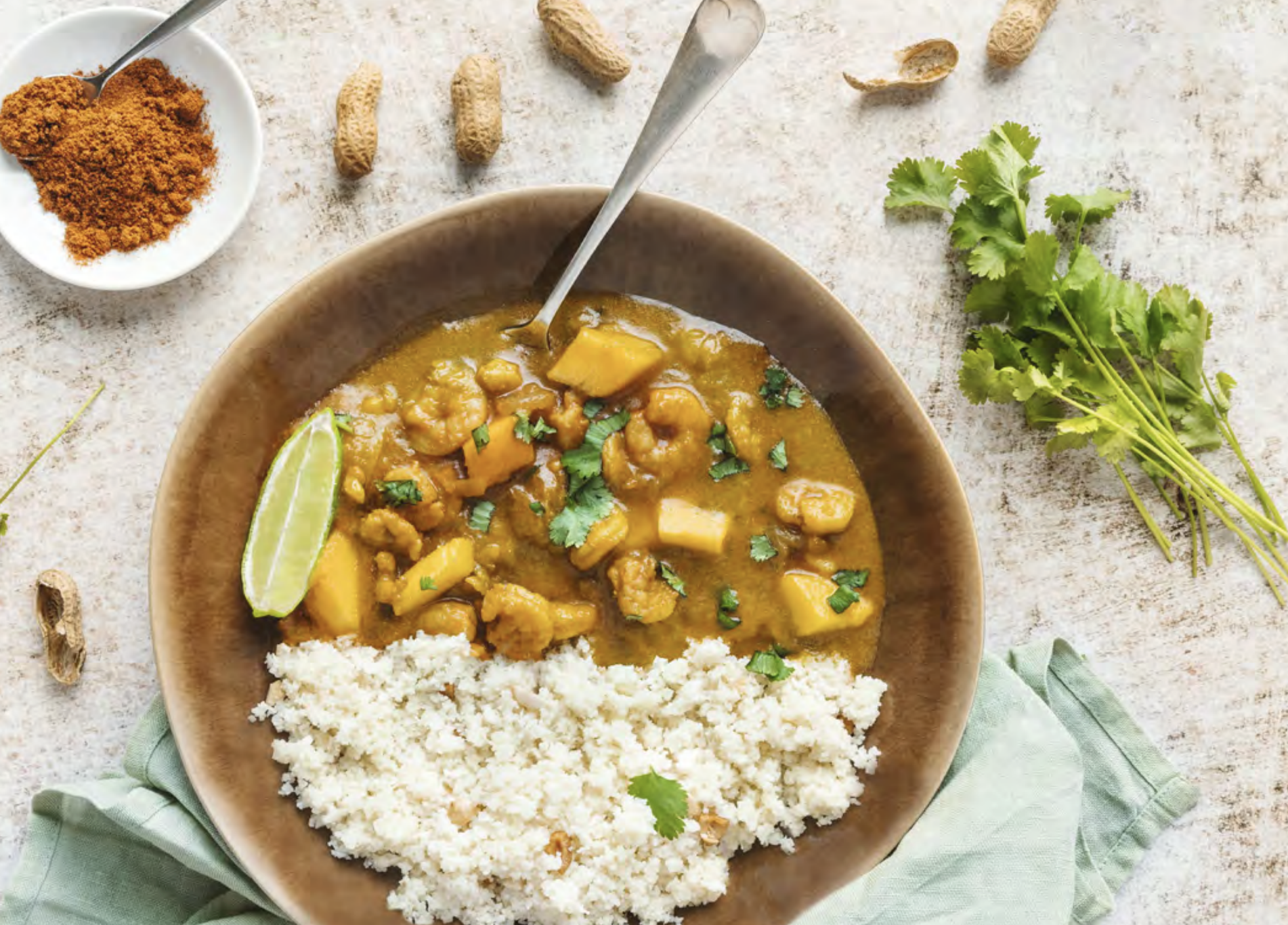 Adicionar a polpa de tomate e o sumo de limão e misturar. Acrescentar o miolo de camarão, os coentros picados, o sal e a pimenta e envolver.