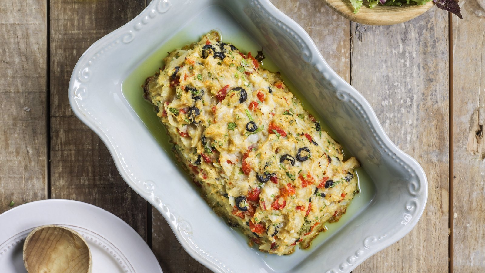 Numa tigela misture o bacalhau com a broa esfarelada, os alhos e os pimentos picados, as azeitonas e os coentros picados.