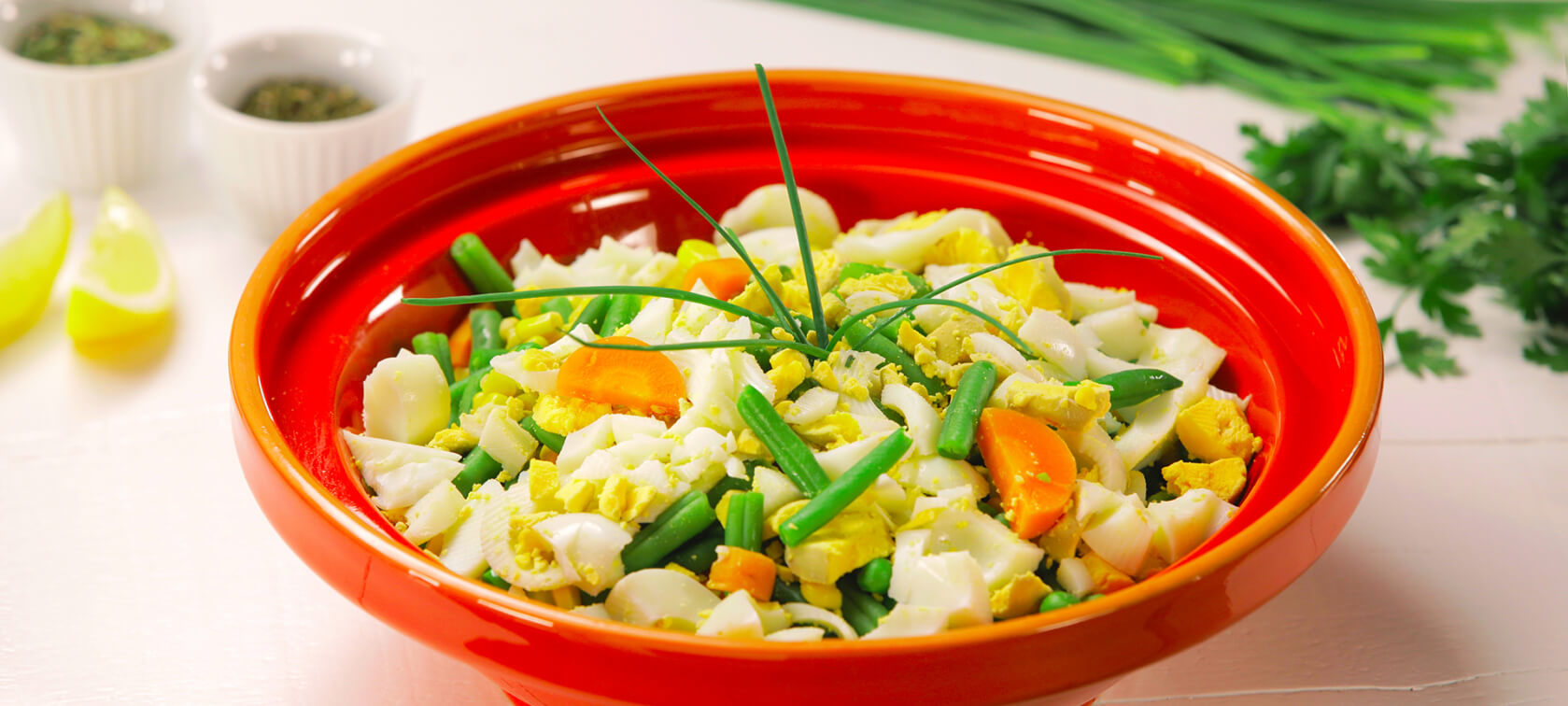 Quando todos os vegetais estiverem cozidos e frios, coloque-os numa travessa grande ou numa saladeira.