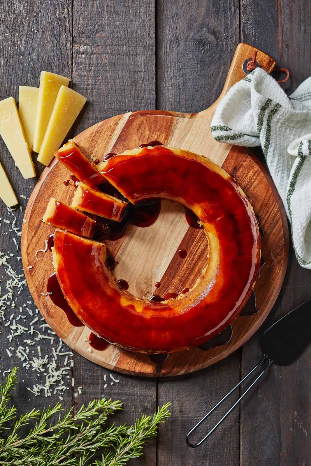 Corte o queijo da ilha em tiras, o chèvre em rodelas e os queijos curados em fatias finas.