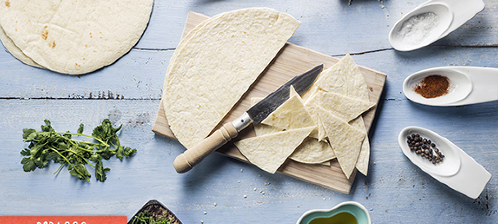 Corte as tortilhas em triângulos, pincele-os com azeite e polvilhe com paprica, sal e pimenta.