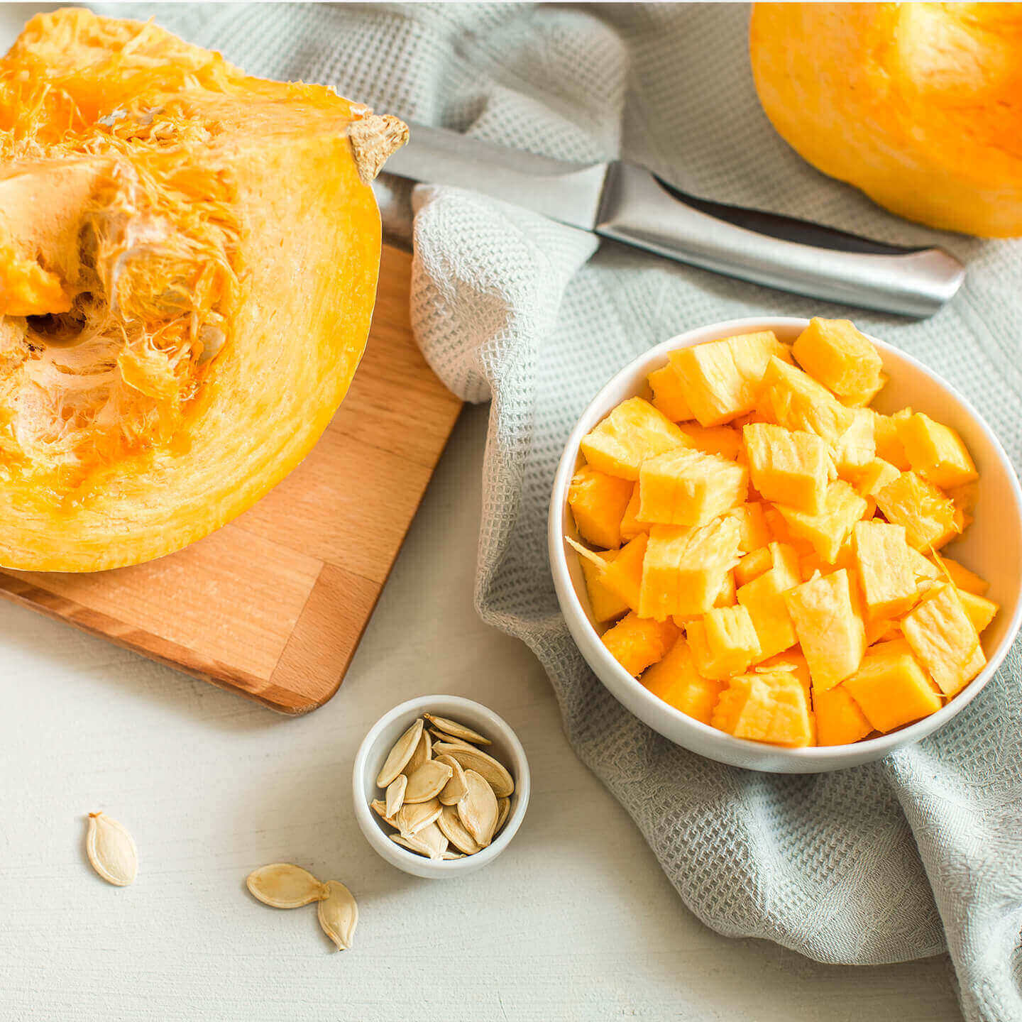 A abóbora é fonte de vitamina A, cuja ação contribui para a manutenção de uma pele e visão saudáveis.