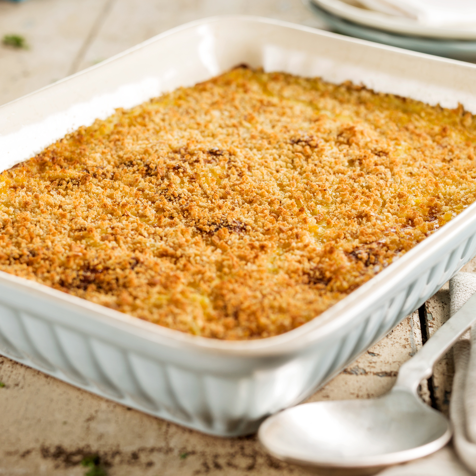 Envolva o molho bechamel com amistura reservada e disponha o preparado num pirex. Cubra o pão ralado e leve ao forno durante 20 minutos a 200ºC.