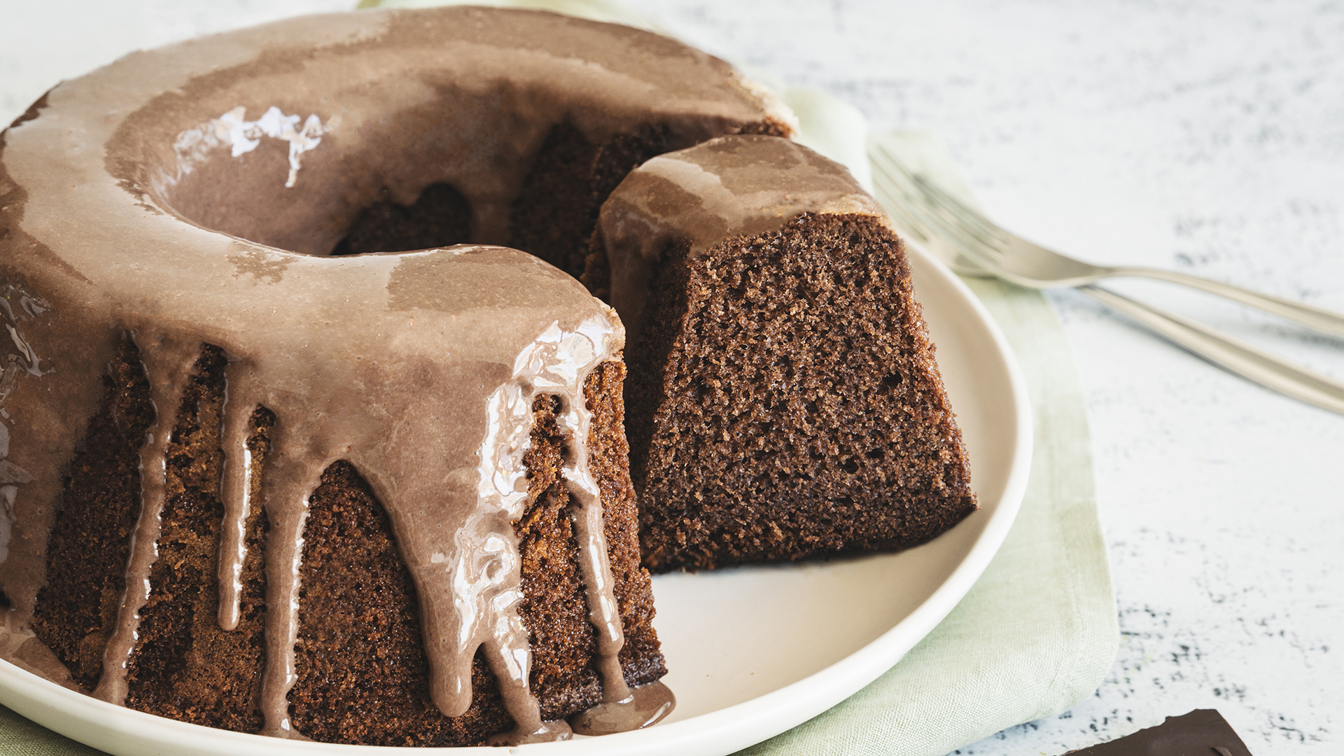 Prepare o caramelo: numa frigideira, deite o açúcar e a água e deixe ferver até que fique com uma cor dourada clara. Verta o caramelo sobre o bolo e decore-o com as metades de noz.