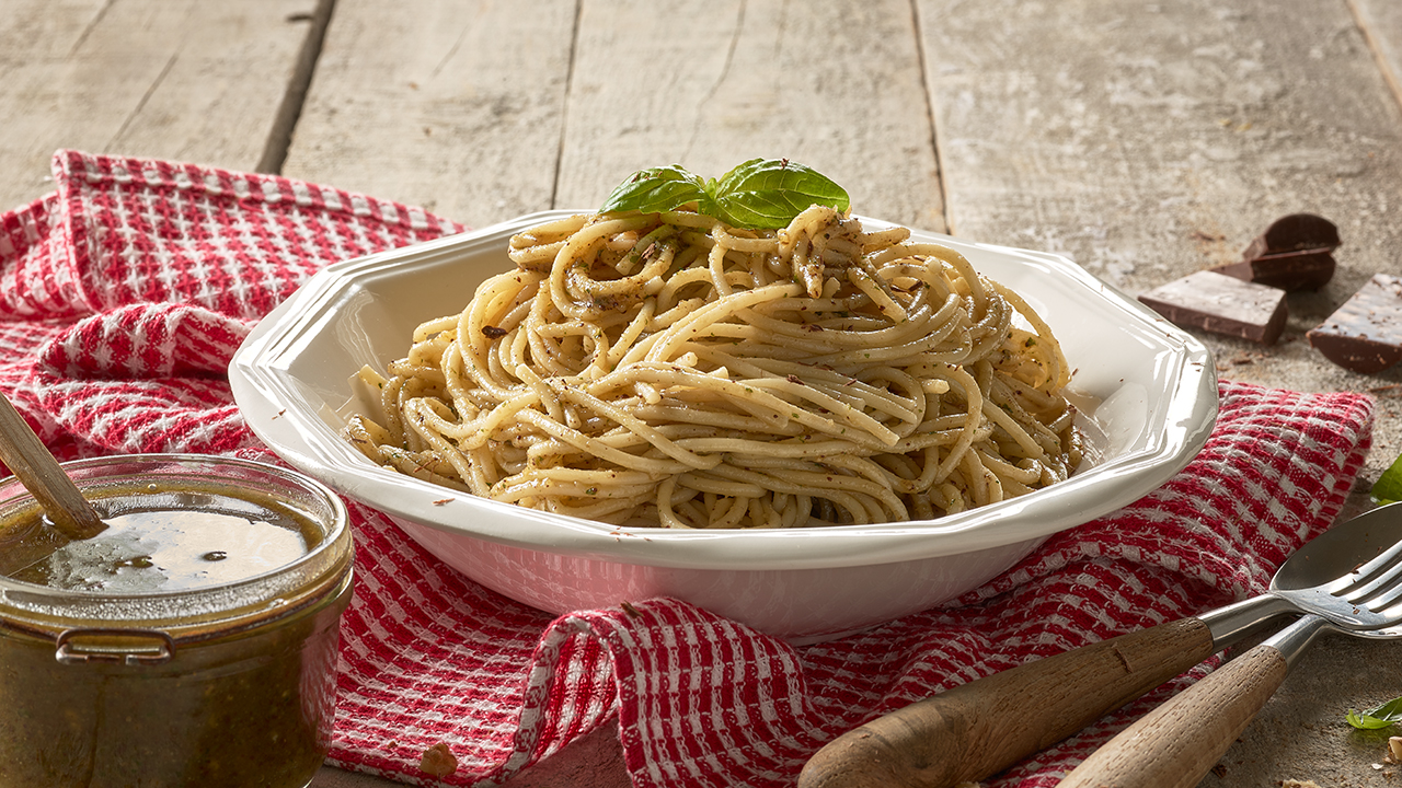 No final do tempo programado, introduza o esparguete pelo orifício da tampa, pressionando um pouco para o ajudar a descer, e programe o tempo indicado na embalagem (cerca de 10 minutos), a 100 °C, Rotação Inversa na velocidade 2, recolocando o copo de medição sobre a tampa. Retire a folha de louro e sirva de imediato.